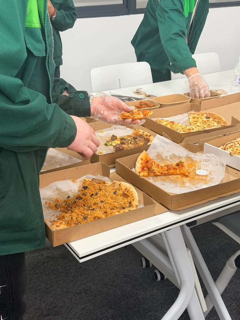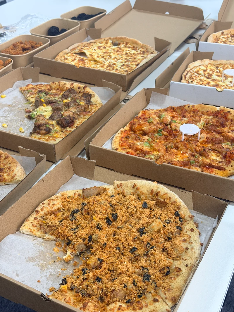 Kothak pizza ngebaki meja, lan kantor langsung kebungkus aroma sing enak. Kesel ilang sakcepete. Kolega ngintip ing monitor, mripate padhang. Ana sing bengok-bengok, "Pizza ana ing kene!" lan kaya ngono, kabeh tim padha ngumpul.
